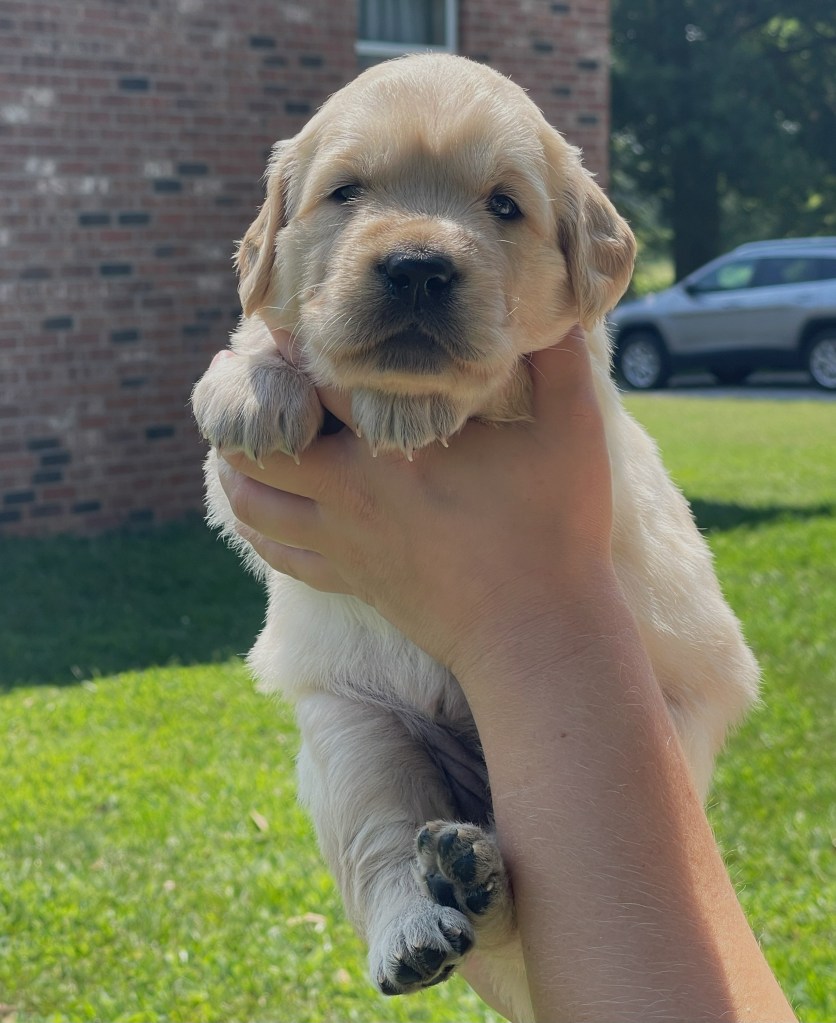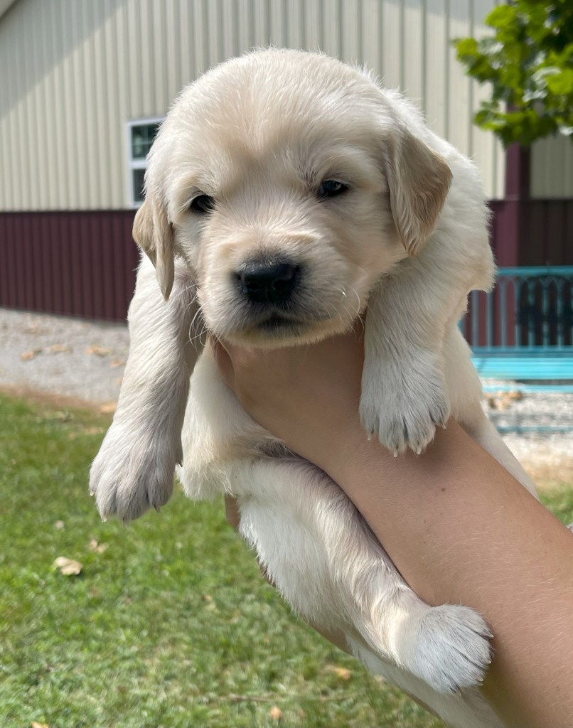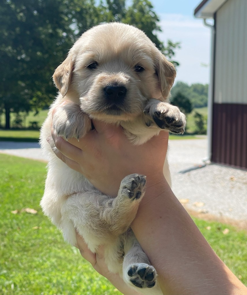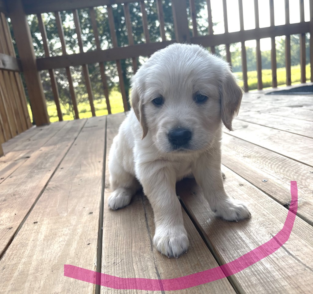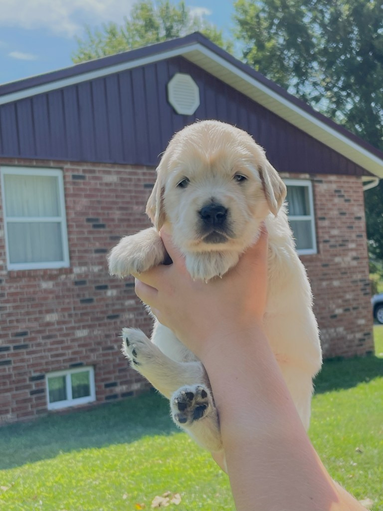 4 weeks today!!!!! We have been busy this week. Started eating kibble and drinking water, and of course, we still have mama’s milk for a snack. We have started using the pellet training box, we are doing good but we need to practice more to get better, and we will. Love exploring new sounds, we have heard huge claps of thunder and lightning and it didn’t bother us at all. We got to go and experience outdoor life (love it) in our new sporty red wagon.! New smells was awesome! We love our toys and wrestling with each other. We have a great bond! We have learned how to escape our area, but we don’t get to stay very long, until we are captured and put back. I swear we are being watched (haha, they got that right). Our favorite thing is the cuddle time we get! Love being held and loved on and return that with our wet little kisses. We are wanting a family that will love Goldens, (we know we can be a handful) with all our energy, love and loyalty. We are eager to please! We will be ready by September 8th to go home with you!