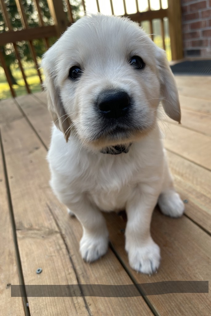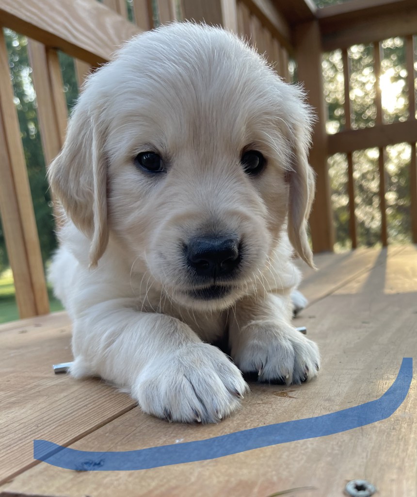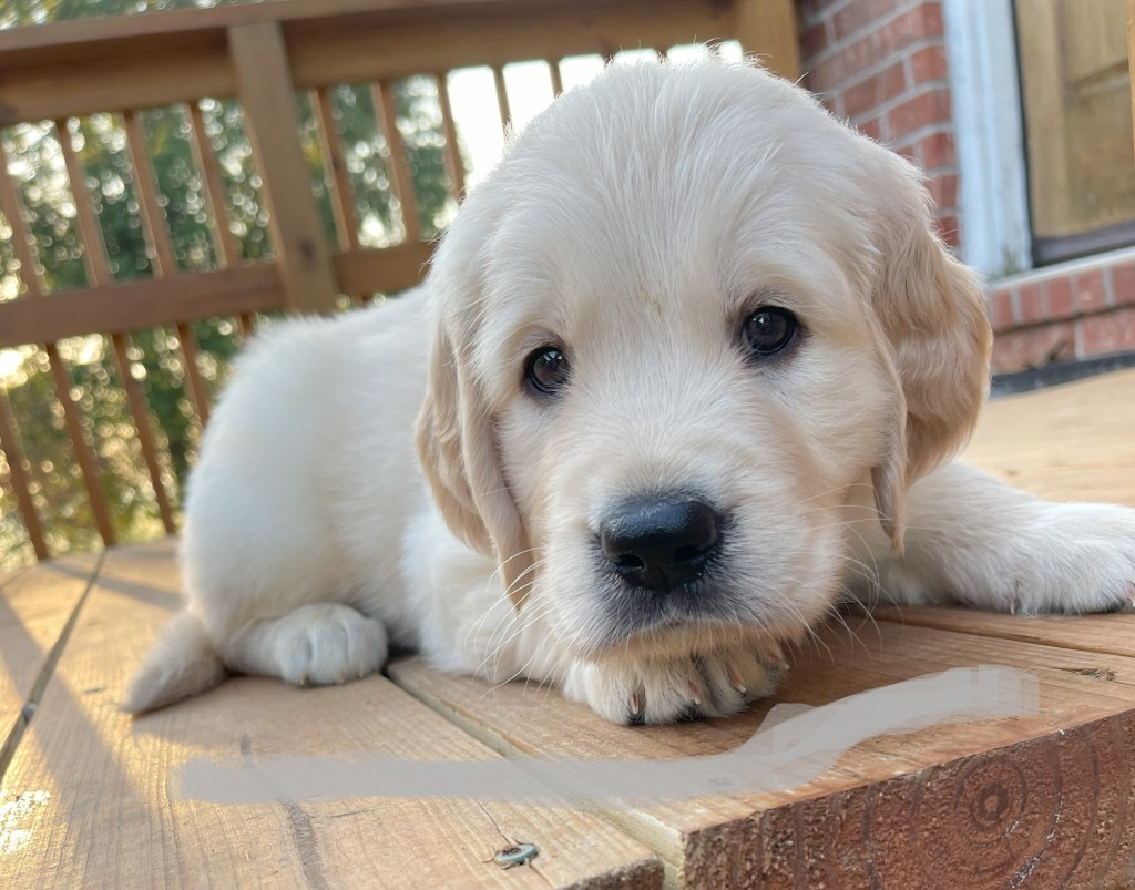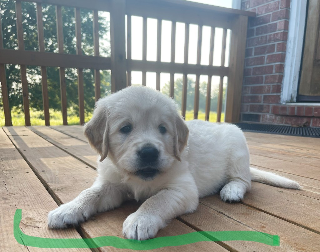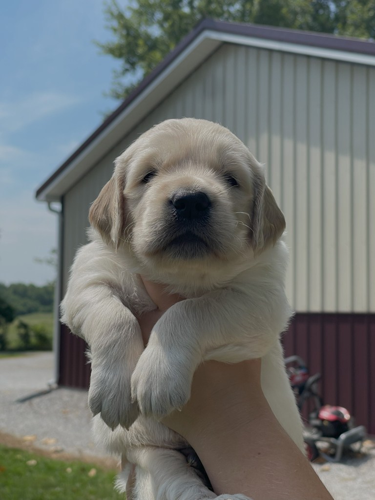 4 weeks today!!!!! We have been busy this week. Started eating kibble and drinking water, and of course, we still have mama’s milk for a snack. We have started using the pellet training box, we are doing good but we need to practice more to get better, and we will. Love exploring new sounds, we have heard huge claps of thunder and lightning and it didn’t bother us at all. We got to go and experience outdoor life (love it) in our new sporty red wagon.! New smells was awesome! We love our toys and wrestling with each other. We have a great bond! We have learned how to escape our area, but we don’t get to stay very long, until we are captured and put back. I swear we are being watched (haha, they got that right). Our favorite thing is the cuddle time we get! Love being held and loved on and return that with our wet little kisses. We are wanting a family that will love Goldens, (we know we can be a handful) with all our energy, love and loyalty. We are eager to please! We will be ready by September 8th to go home with you!