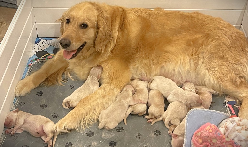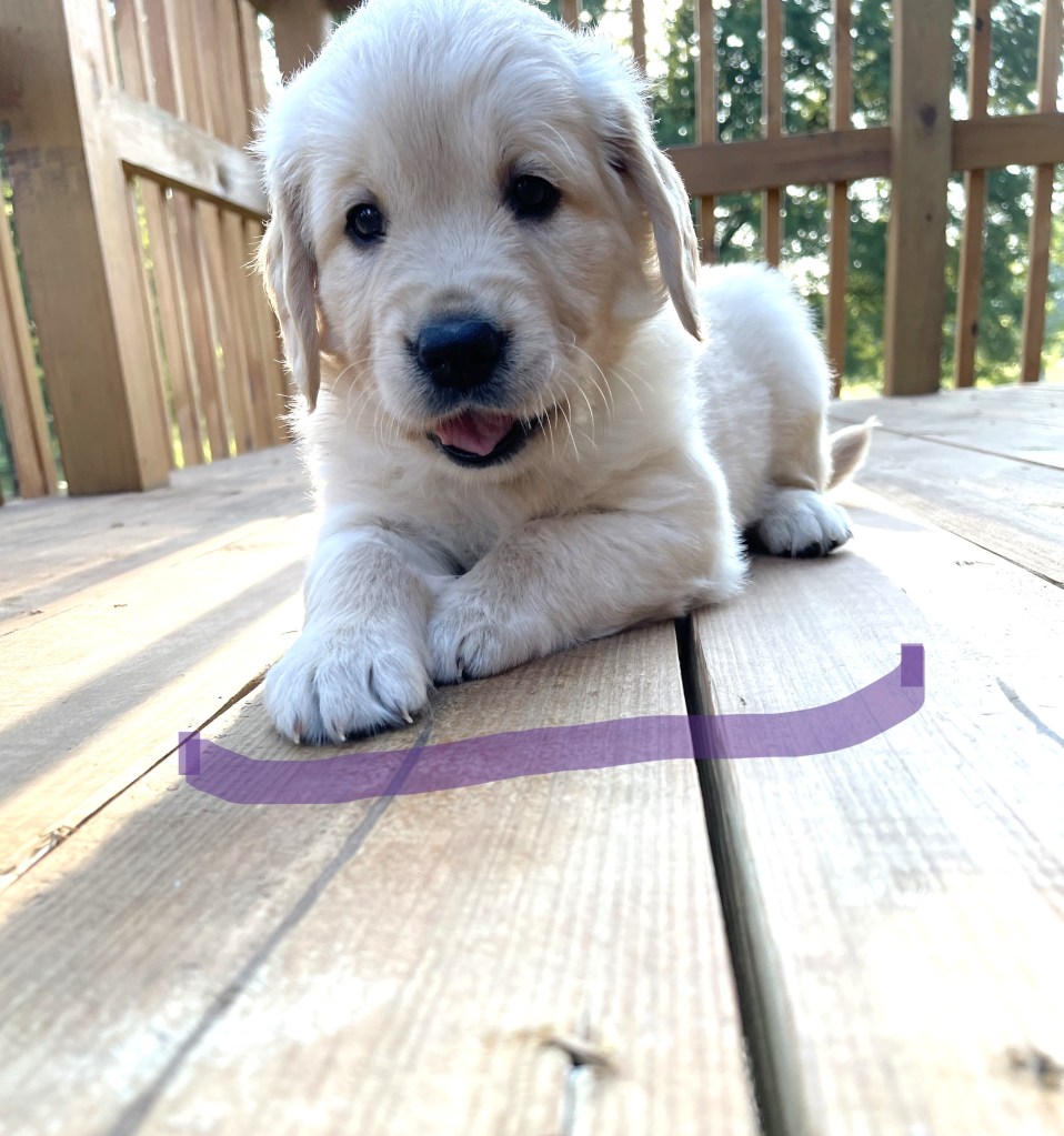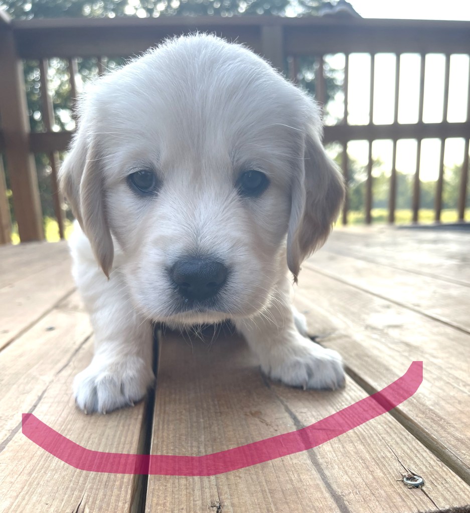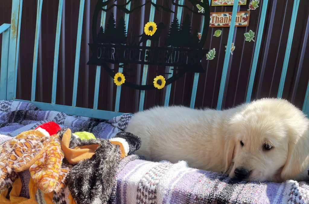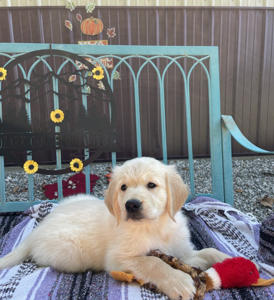 4 weeks today!!!!! We have been busy this week. Started eating kibble and drinking water, and of course, we still have mama’s milk for a snack. We have started using the pellet training box, we are doing good but we need to practice more to get better, and we will. Love exploring new sounds, we have heard huge claps of thunder and lightning and it didn’t bother us at all. We got to go and experience outdoor life (love it) in our new sporty red wagon.! New smells was awesome! We love our toys and wrestling with each other. We have a great bond! We have learned how to escape our area, but we don’t get to stay very long, until we are captured and put back. I swear we are being watched (haha, they got that right). Our favorite thing is the cuddle time we get! Love being held and loved on and return that with our wet little kisses. We are wanting a family that will love Goldens, (we know we can be a handful) with all our energy, love and loyalty. We are eager to please! We will be ready by September 8th to go home with you!